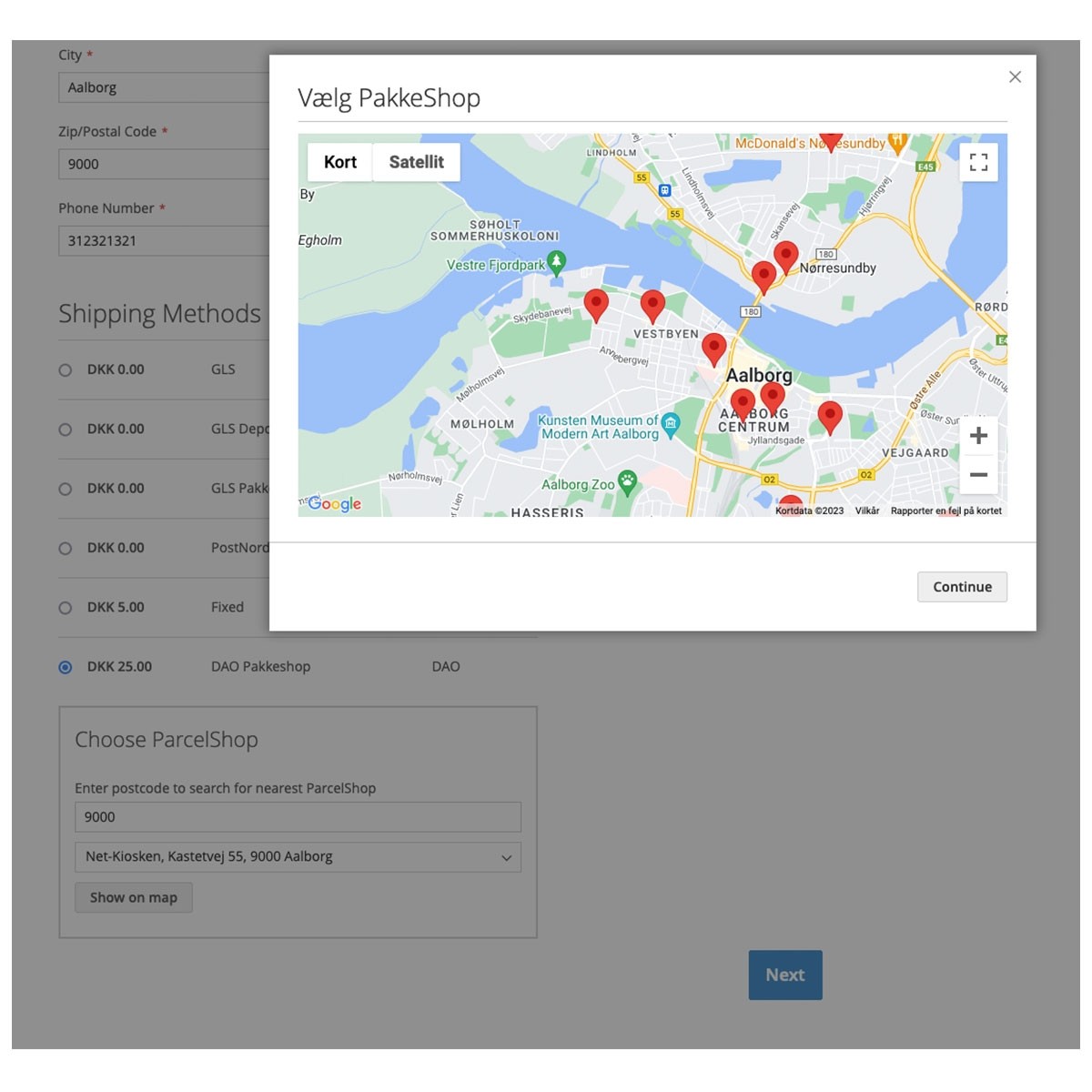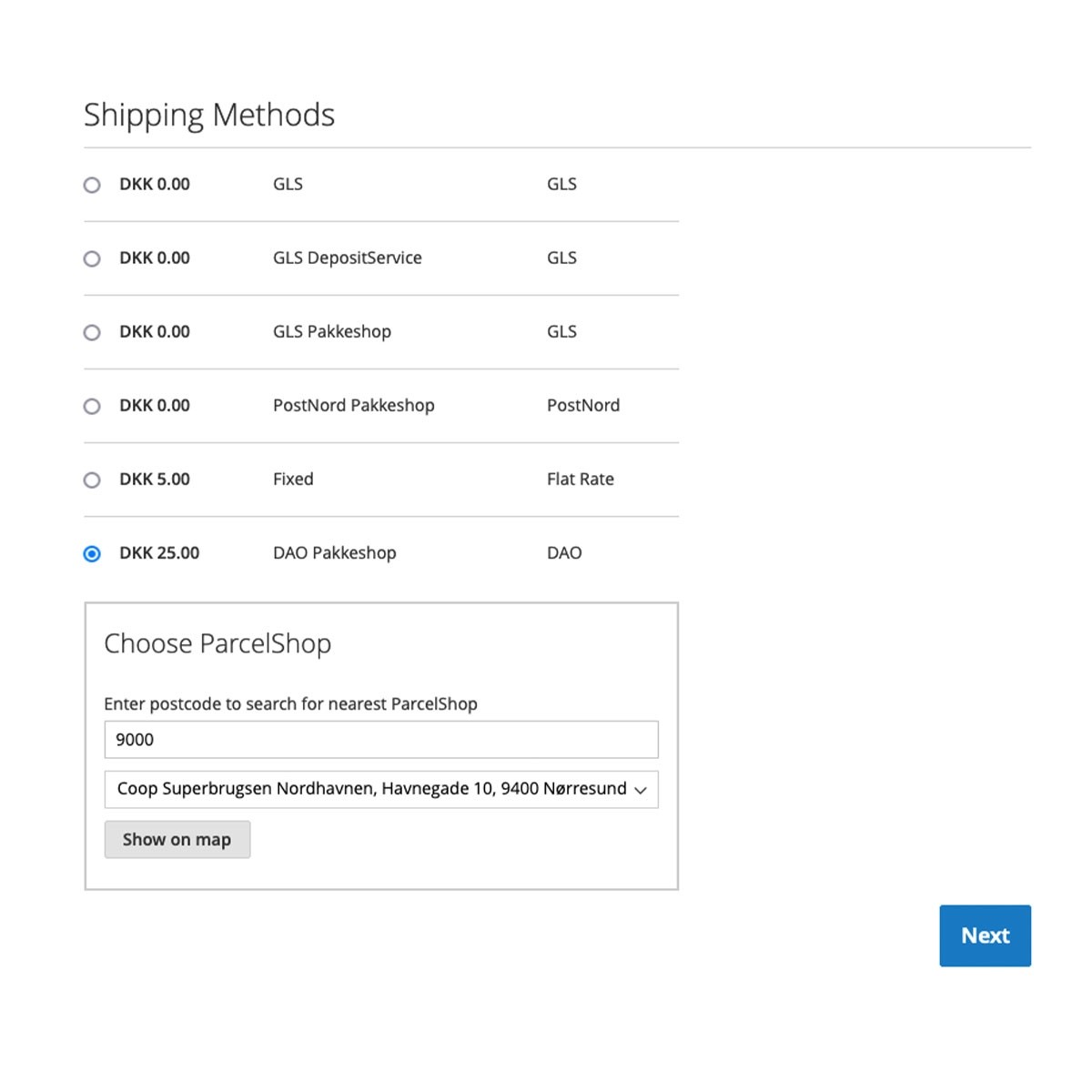 Med DAO modulet til Magento kan du tilbyde levering til DAOs pakkeshops. Disse vises på din webshop i en elegant responsiv form både med Googlekort (bemærk, at kortvisning kræver opsætning og brug af Google Maps API) og listevisning. Afhentningssteder kan søges pr. postnummer, og de tilgængelige steder hentes dynamisk fra DAOs webservice. Du skal således ikke bekymre dig om at vedligeholde afhentningssteder.