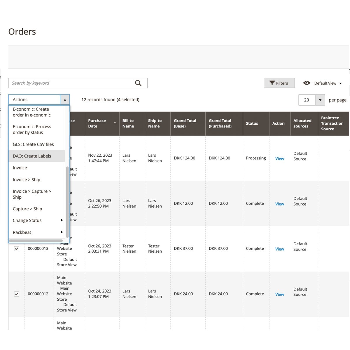 Fra hver enkelt ordre eller fra ordreoversigten kan du nemt med få klik oprette forsendelser hos DAO, og du kan herefter udskrive en label, der er lige til at påføre din pakke. Du har også mulighed for at markere flere ordrer af gangen og overføre dem alle på én gang via en handling. Det letter din ordrebehandling meget, hvis du har et stort ordreflow.