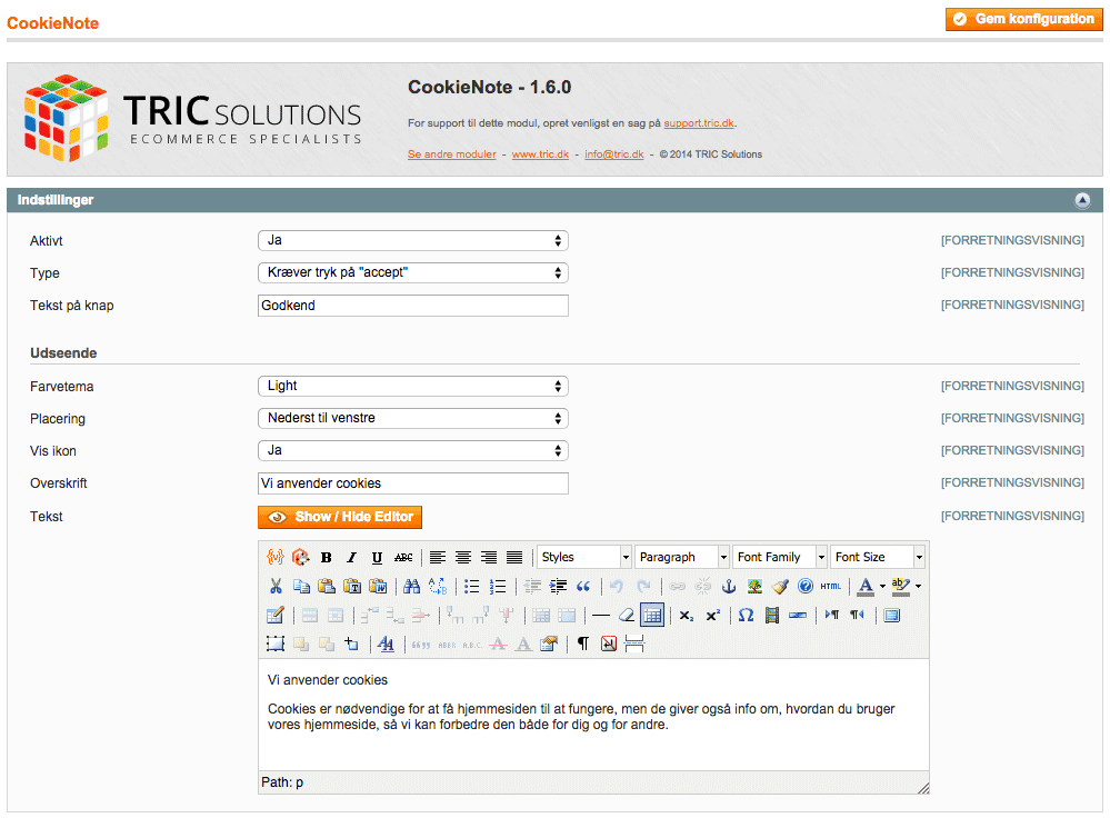 Ønsker du noget andet end Magentos standard cookiebesked, så har TRIC et godt tilbud til dig. Du kan kvit og frit downloade vores lille modul CookieNote til din Magento webshops. Med CookieNote får du en diskret cookie-besked til shoppen, og fra Magento administrationen har du let adgang til at redigere cookiemeddelelsen, ændre farvetema og placering samt aktivere/deaktivere det medfølgende cookie-ikon.