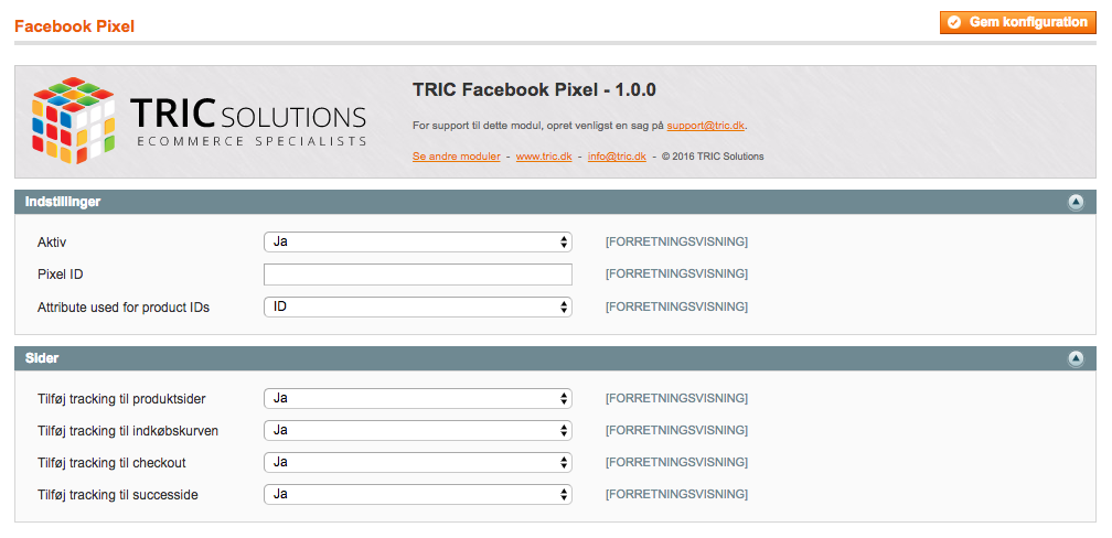Magentomodulet Facebook Pixel fra TRIC Solutions gør det nemt og hurtigt for dig selv at indsætte Facebook Pixel kode. Faktisk så nemt, at det ikke kræver noget kendskab til programmering, da det hele styres fra back-end. Du slipper derfor for at skulle ned og rode direkte i filerne, da modulet selv indsætter det nødvendige kode.