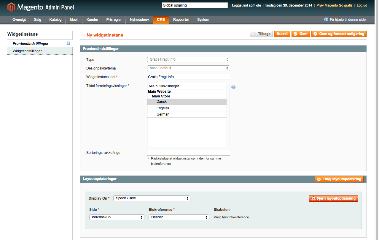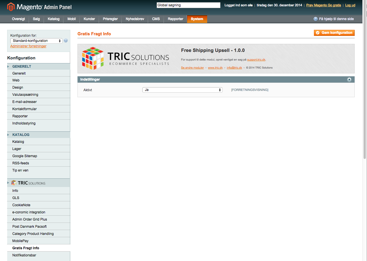 Magentomodulet fra TRIC Solutions installerer en widget, som du kan indsætte i det ønskede område på den ønskede side. Modulet kan indstilles og aktiveres/deaktiveres pr. forretningsvisning.