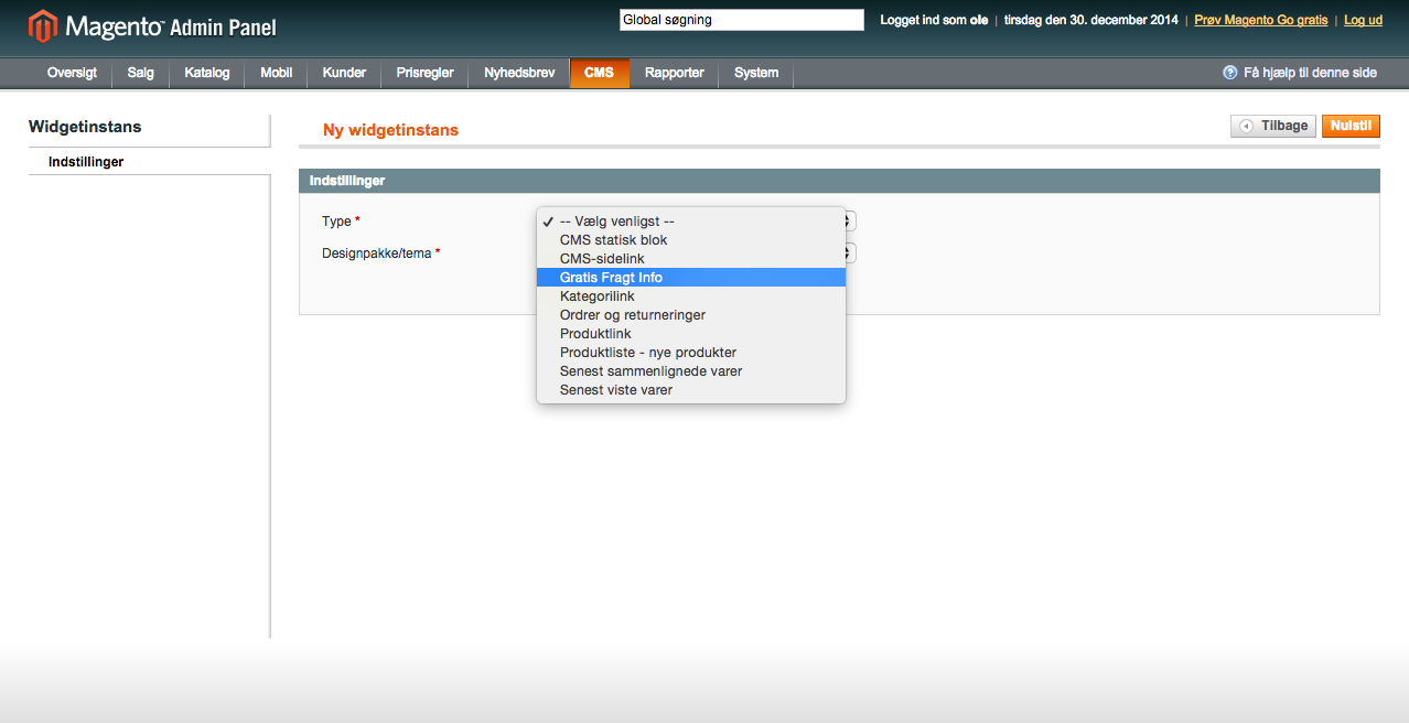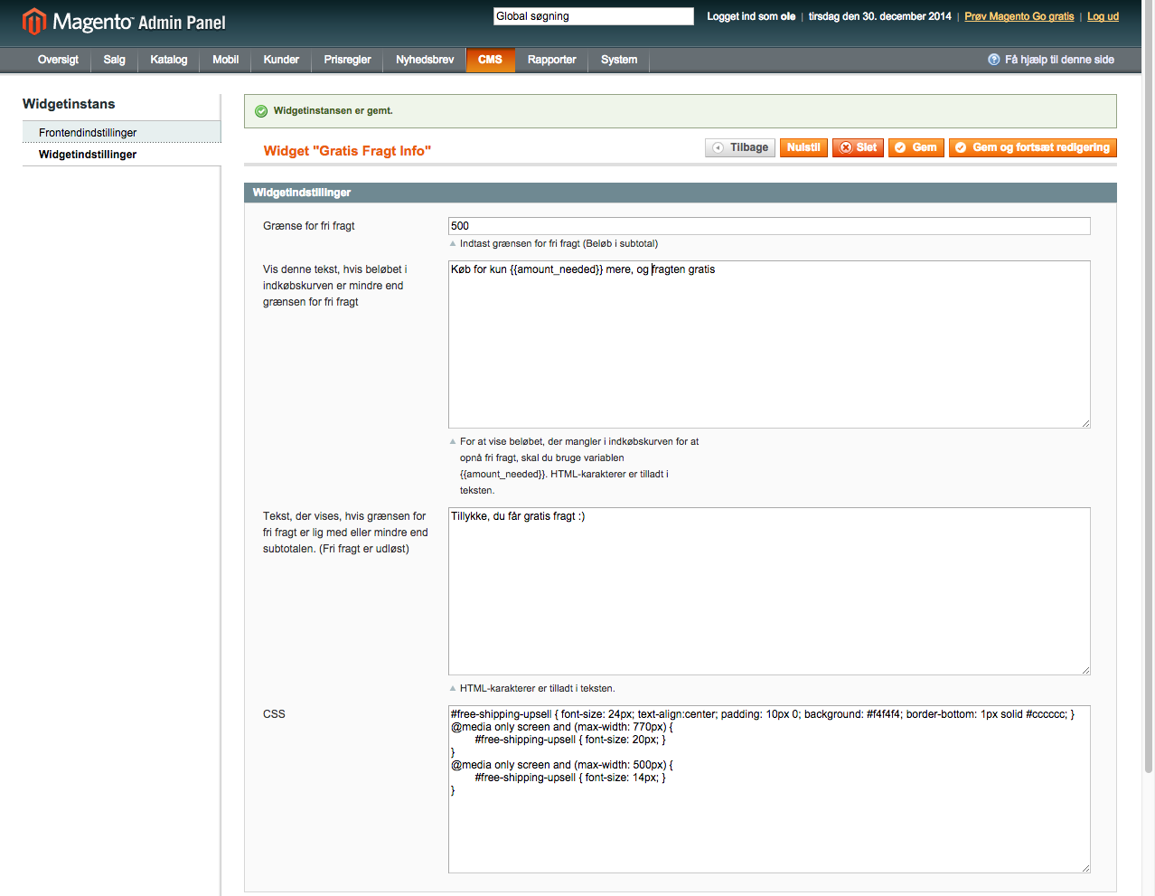 Direkte i Magento administrationen under CMS - Widgets kan du indstille tekster og beløbgrænse, og hvis beløbet i indkøbskurven er mindre, end grænsen for fri fragt, tæller widget'en ned. Når grænsen er nået, udløser Gratis Fragt Info en ny tekst, der evt. ønsker tillykke med den gratis fragt.