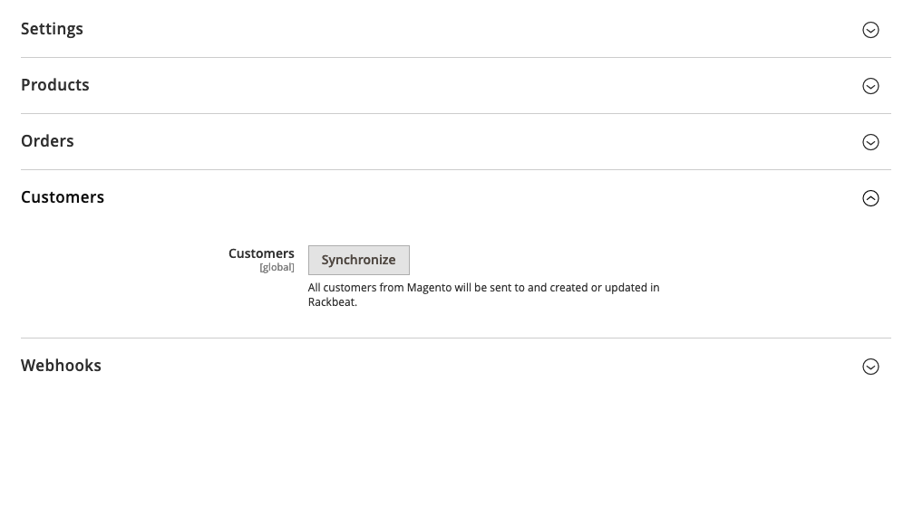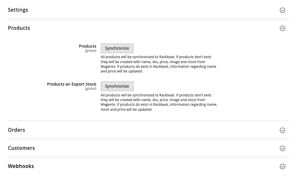 Indledningsvis har du mulighed for at synkronisere dit lager og produkter fra Magento til Rackbeat. På den måde er du hurtig i gang og kan med det samme begynde at administrere dit lager fra Rackbeat.